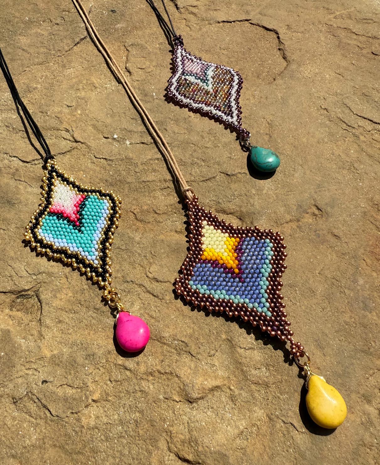 Teardrop shaped beaded pendant with stone drop