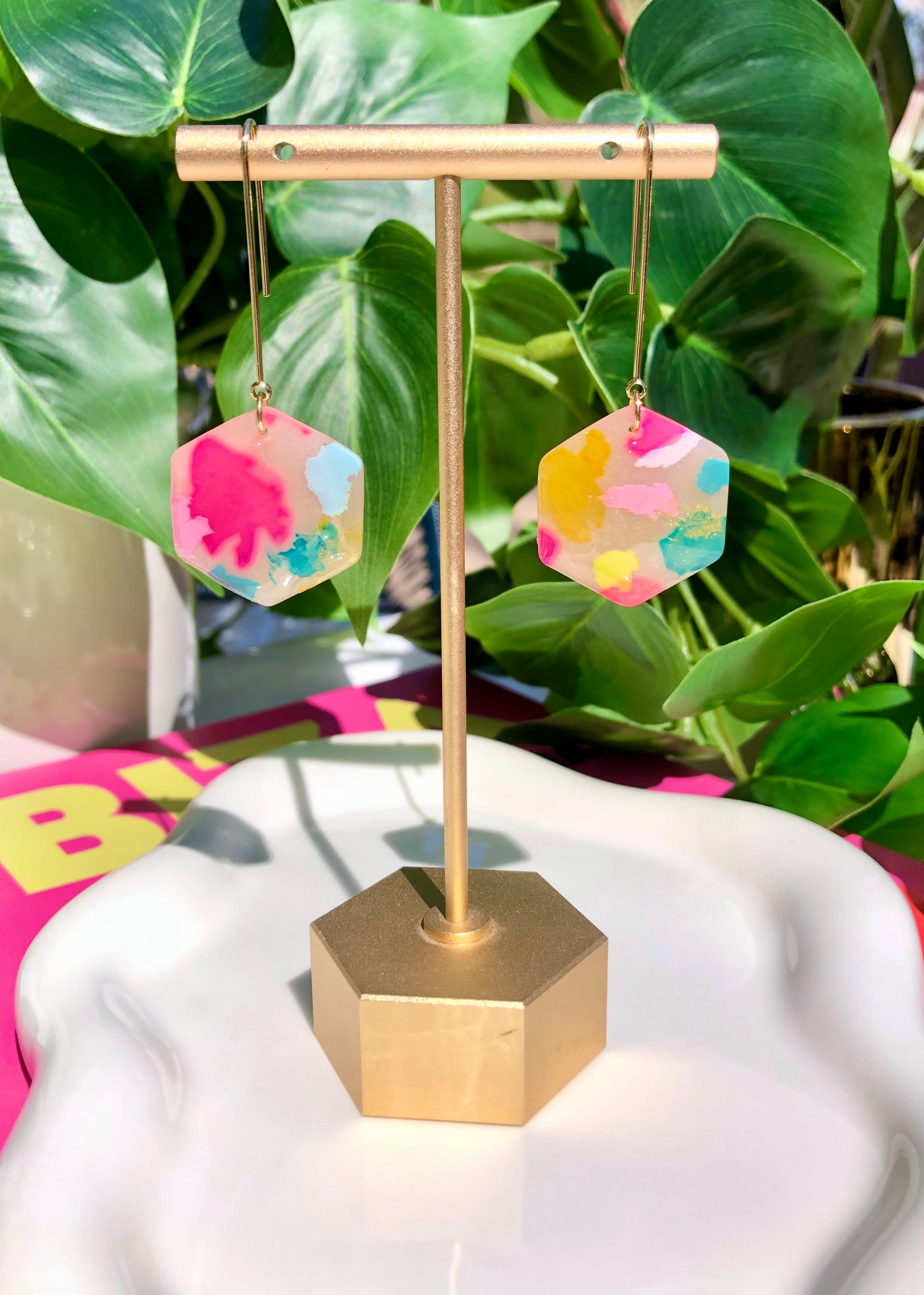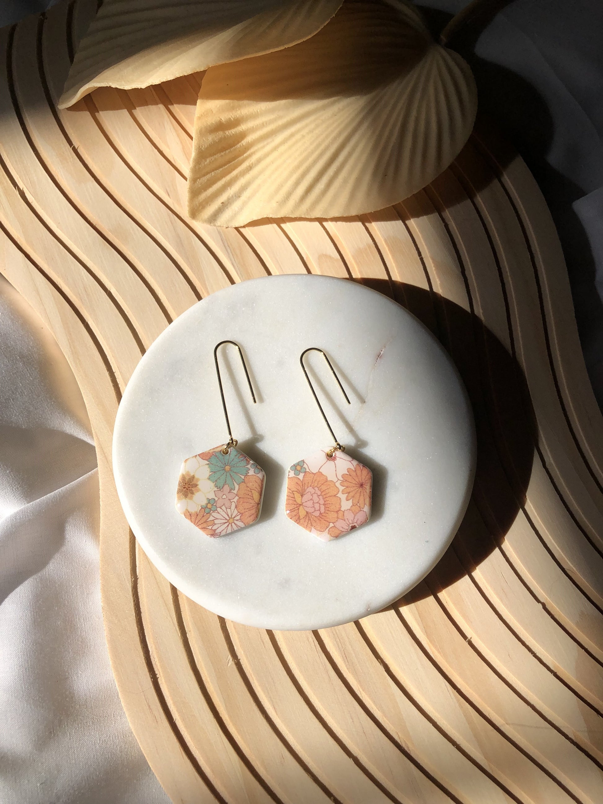 Lightweight polymer clay. Gold-plated stainless steel posts. Measures ~2.25 inches. There may be variations in texture or color in pieces, but that's what makes clay earrings one of a kind!