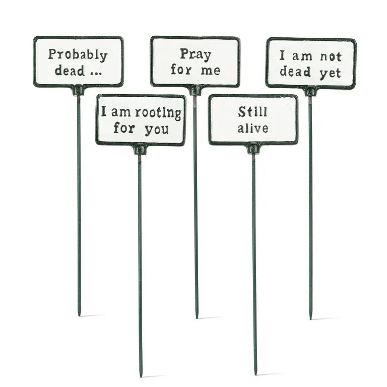 Show your neighbours your green thumb (or lack there of) with these Garden Signs! Crafted out of antique white cast iron, these humourous mini signs feature witty horticultural phrases such as "I'm rooting for you" and "Pray for me." Perfect for your garden, patio, or yard. Durable and weather-resistant, these signs add personality to your outdoor decor.