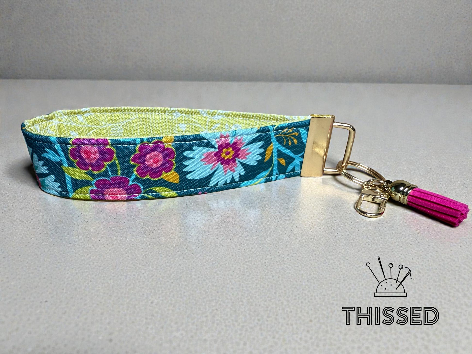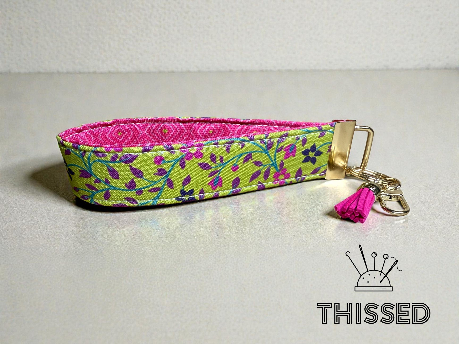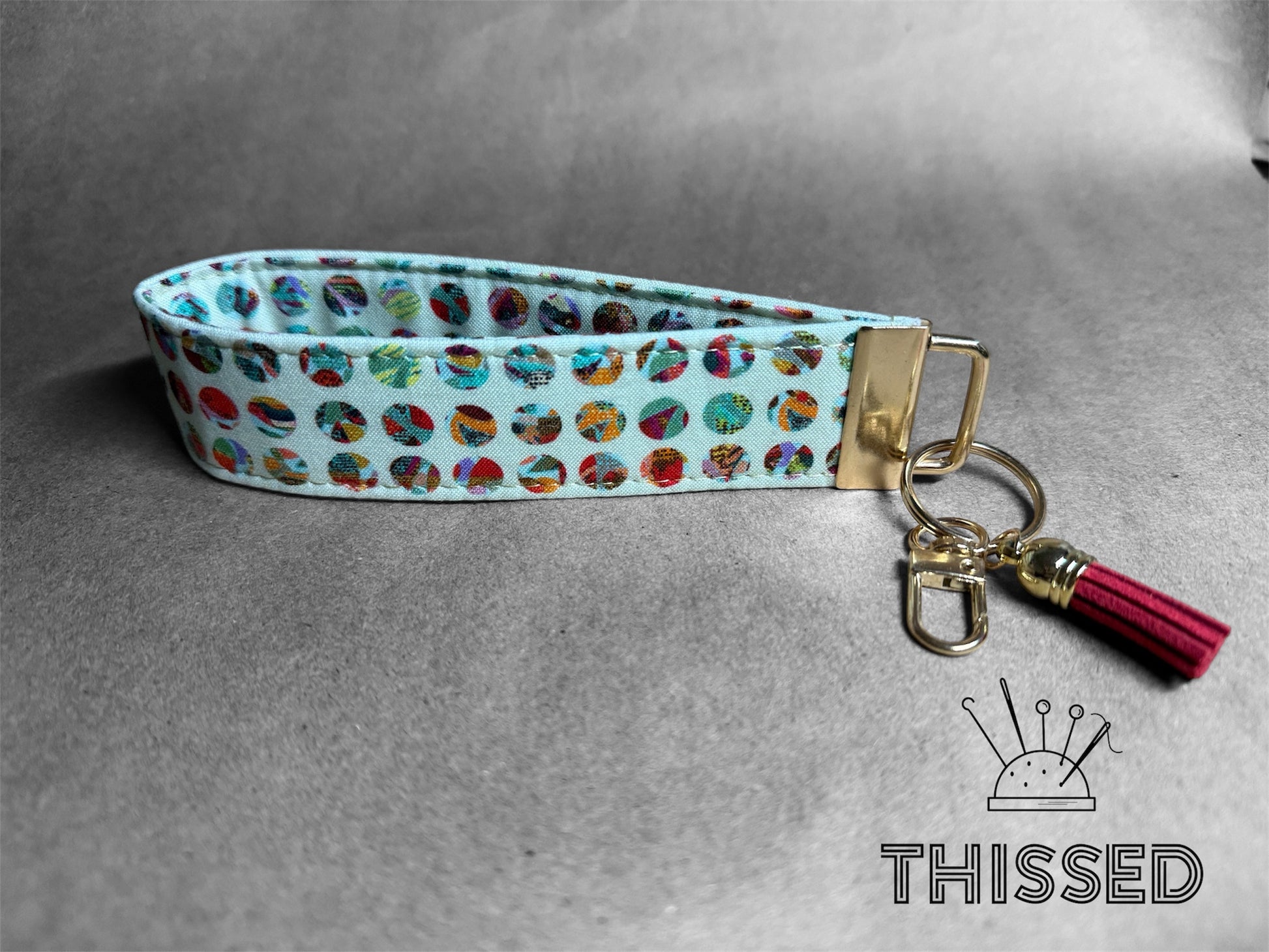 Keys, but make them easy to find. The Thissed TagAlong is sturdy, lightweight, and slips right over your wrist so you can keep your hands free and your keys close. A built-in clasp lets you hook it to bookbags, handbags, lanyards—wherever you need them. Made with eye-catching fabrics, it’s perfect for quick errands, campus life, or just not losing your keys at the bottom of your bag. Simple. Handy. Hard to misplace. 1.25 x 6 in.